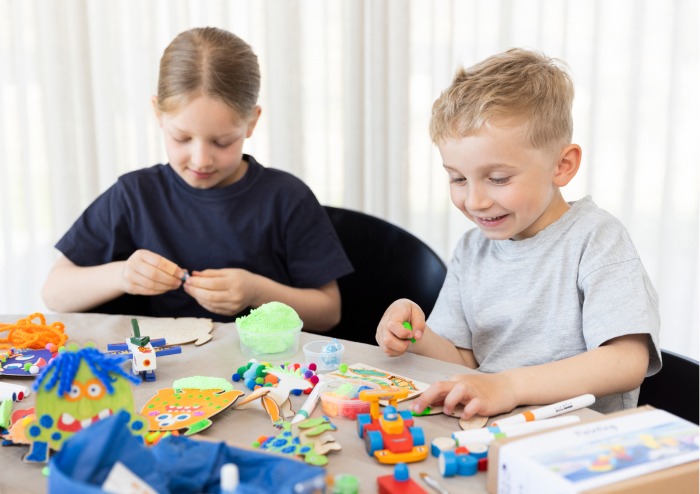 For slightly older children, textile decoration can be enriched with small details such as felt, glitter clay, glitter and other decorative elements, allowing them to play with texture and surface. In this way, textile decoration supports creativity, fine motor skills and confidence – all at the child’s own pace.